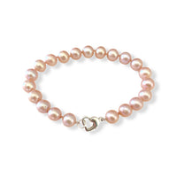 This is our classic freshwater cultured pearl bracelet in pink. Hand knotted by our makers in the Athens, GA, this timeless bracelet is available with a sterling heart clasp for a limited time!