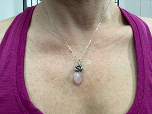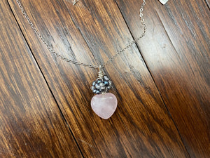 These beauties feature a soft pink rose quartz carved in the shape of a delicate heart. They are on sterling silver with a cluster of small pearls. Or not, we do have a design without pearls.