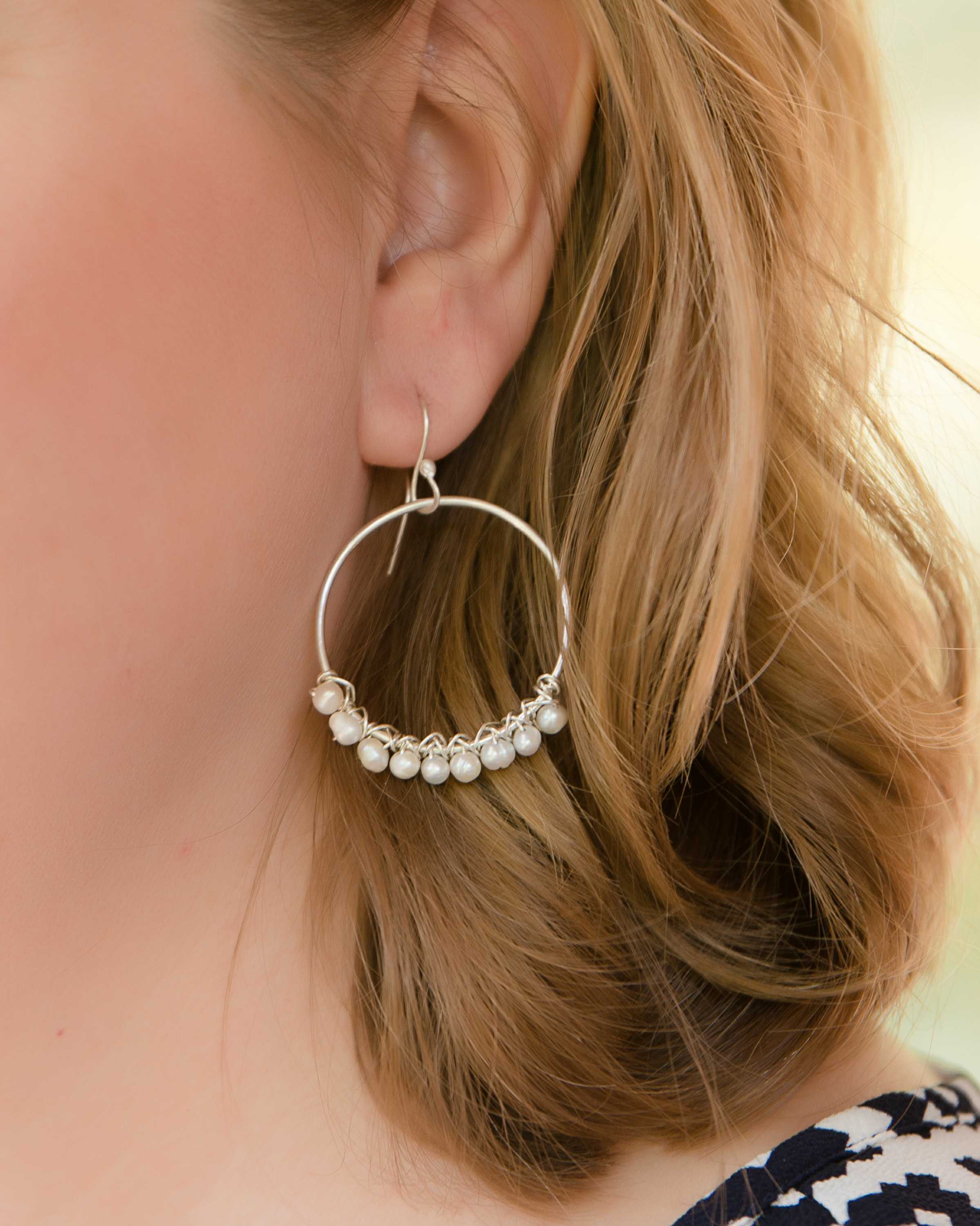 These earrings are stunning! Sylvia creates them in three different sizes: small and medium are only slightly covered in pearls and the large hoops are covered in pearls. She crafts them in sterling silver and the earring hooks are sterling (and nickel free!).